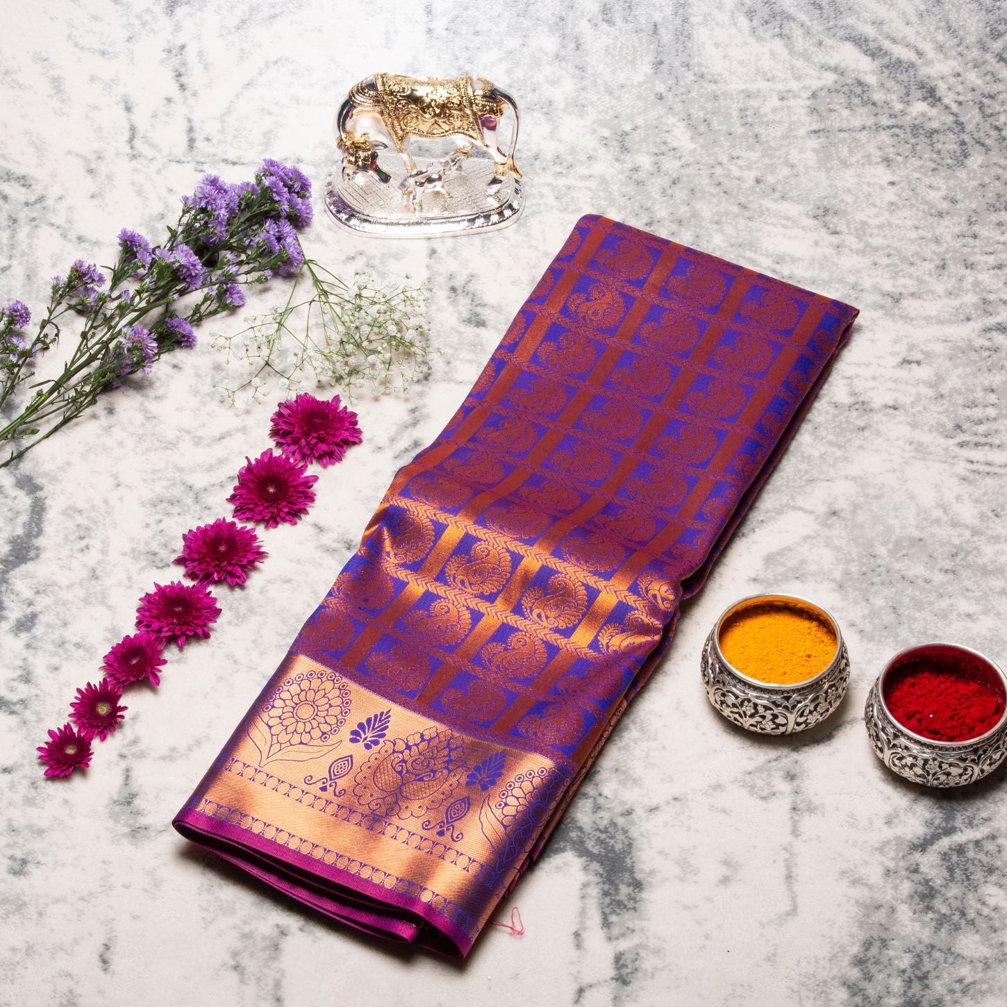 Rich Copper Work With Contrast Blouse And Rich Pallu