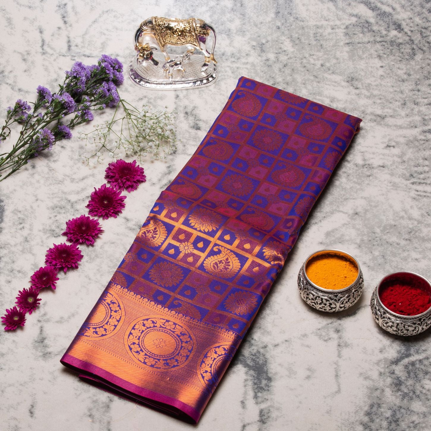 Rich Copper Work With Contrast Blouse And Rich Pallu